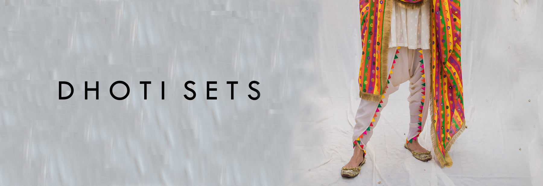 This dropped hem Tunic has delicate Sitara Embroidery on the neckline and sleeves. Paired with a cotton thread fringe dhoti .This easy breezy ensemble is perfect for a sunny brunch or mehendi.