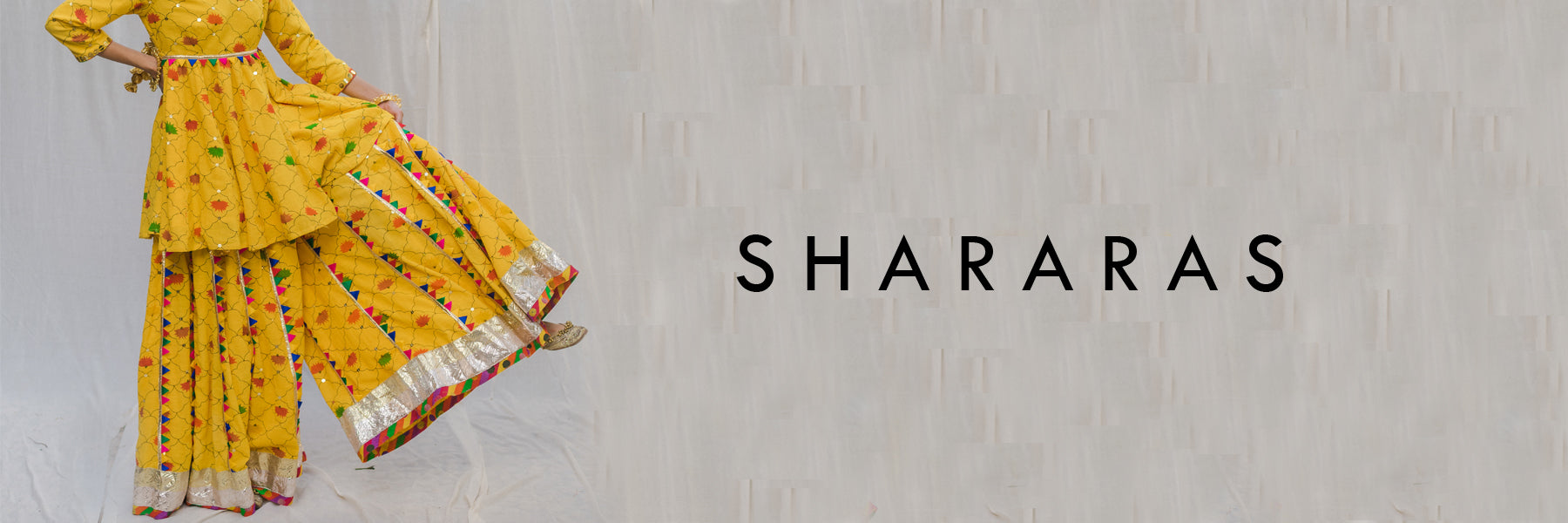 This vibrant three piece Sharara set is in our signature Kamal print. Delicate Sitara embroidery sparkles all over this ensemble . Hyderabadi Gota and hand folded colourful fabric triangles highlight this festive outfit.